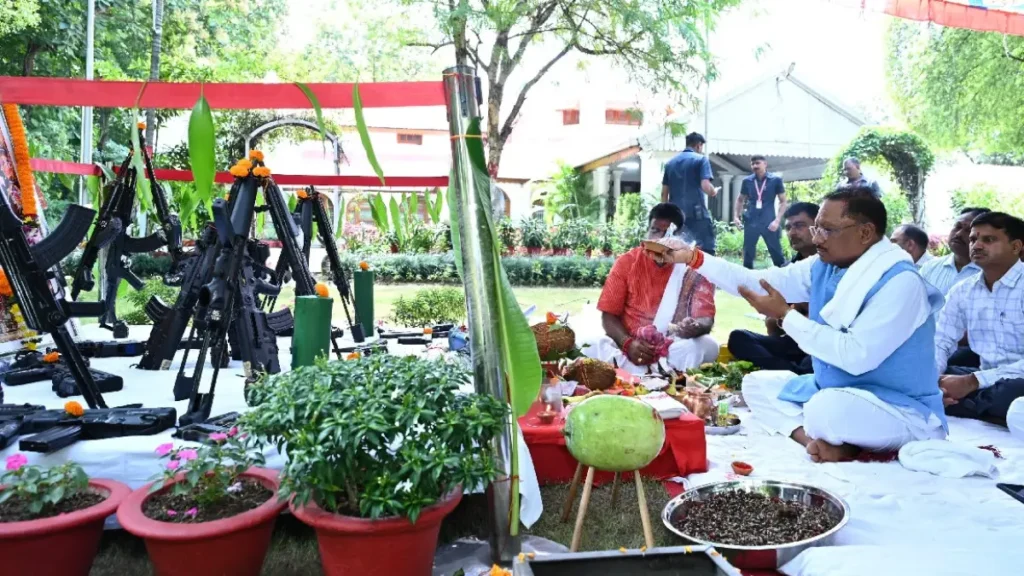 सीएम विष्णु देव साय विजयादशमी के अवसर पर अपने निवास कार्यालय में शस्त्र पूजा की। उन्होंने विधि-विधान से शस्त्रों की पूजा की और मां भगवती की आराधना की।