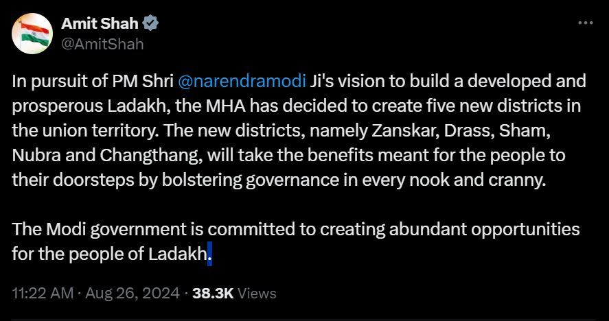 केंद्रीय गृहमंत्री अमित शाह ने अपने एक्स हैंडल से जानकारी देते हुए कहा कि, पीएम नरेंद्र मोदी के अनुसरण में विकसित और समृद्ध लद्दाख बनाने के दृष्टिकोण के तहत गृह मंत्रालय ने केंद्र शासित प्रदेश में पांच नए जिले बनाने का निर्णय लिया है।