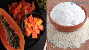 नरम गूदे वाला पका हुआ पपीता एक कटोरे में लें, इसे मैश करके पेस्ट तैयार कर लें। फिर आधा चम्मच चावल का आटा और आधा चम्मच शहद,आधा चम्मच शक़्कर और गुलाब जल मिलाकर चेहरे पर लगाएं। आधे घंटे बाद जब फेस पैक सूख जाए तो इसे ठंडे पानी से धो लें। आपकी त्वचा चमक उठेगी। कालापन दूर होगा।