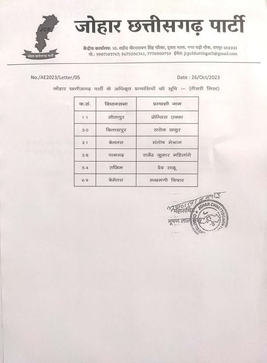 यहां देखें जोहार छत्तीसगढ़ पार्टी की तीसरी लिस्ट