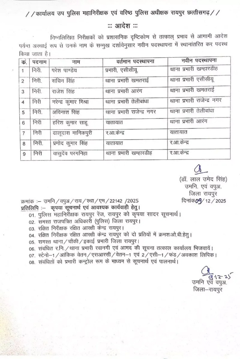 TI Transfer: रायपुर में 9 थाना प्रभारियों का तबादला, आदेश जारी
