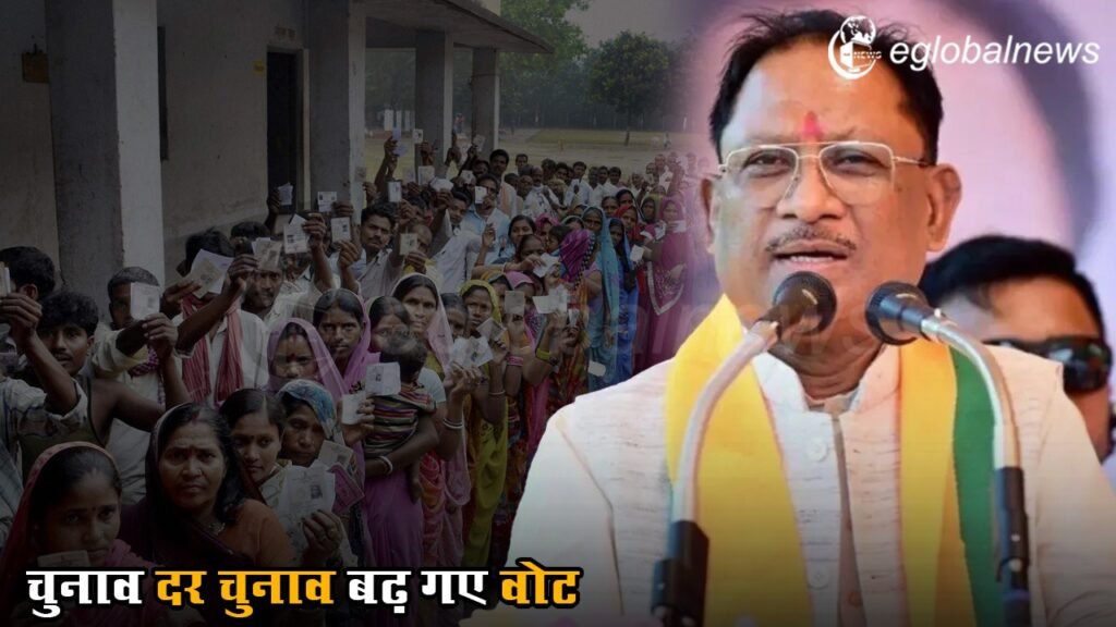 विधानसभा चुनाव में भाजपा को 46.27 प्रतिशत वोट मिले थे वहीं कांग्रेस का वोट प्रतिशत 42 23 फीसदी था। विष्णुदेव साय के मुख्यमंत्री बनने के बाद लोकसभा चुनाव हुए। भारतीय जनता पार्टी ने 52.65 प्रतिशत वोट हासिल किए। वहीं कांग्रेस के वोट विधानसभा से भी कम होकर 41.06 प्रतिशत रह गए। वहीं नगरीय निकाय चुनाव में भाजपा को 56 फीसदी वोट मिले हैं जो विधानसभा से 13.73 फीसदी ज्यादा है।